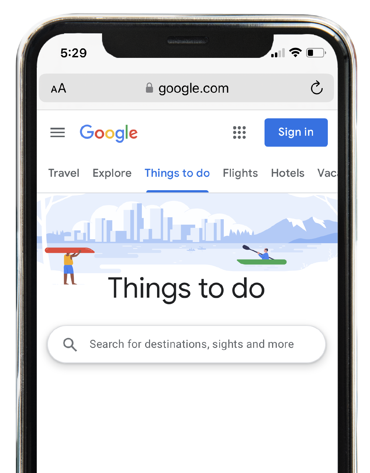 Below we will go over the different surfaces you will see your Things to do listings displayed. These surfaces are Google Search, Google Maps and Google Travel and Google Business Profile. With each description you will see an animation of how the listings are displayed.