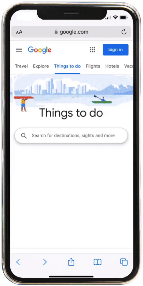 In this example we have someone using the popular search term "Things to do in Seattle", again this should work when searching "Things to do in your city". You will see there is a "Top Sights in" section which works the same way as the City Search surface above. The user can scroll and swipe through the different POIs and see companies who offer experiences that include those POIs. The user can click on the company and be taken directly to the operator website for more information and hopefully to make a booking.