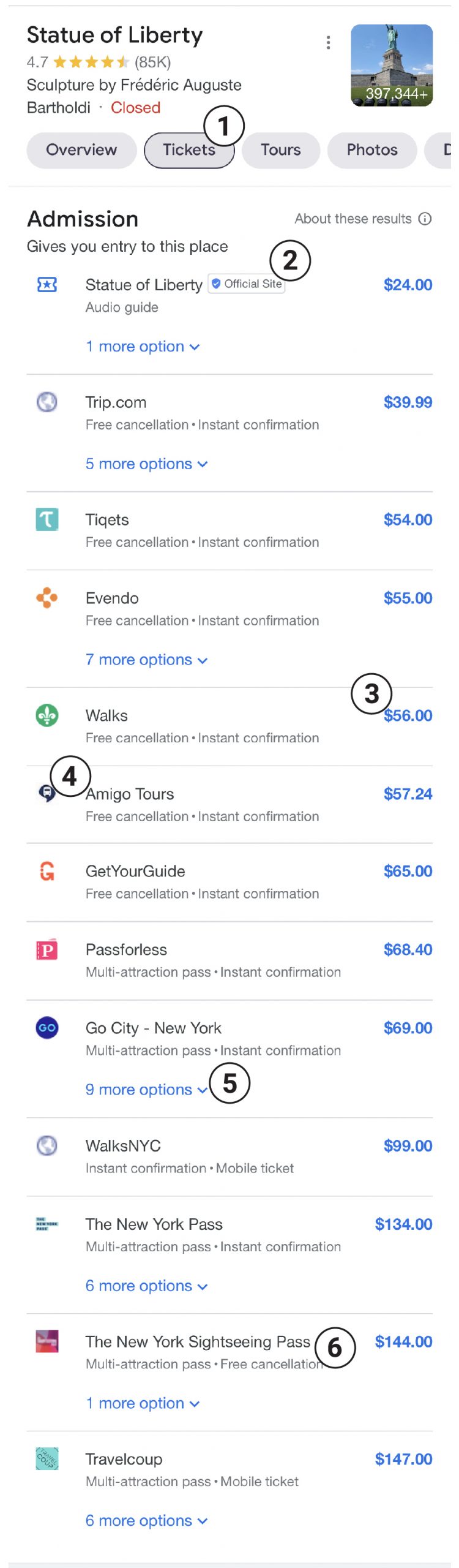 The Admissions section on Google Things to do is where you can be featured if you are an attraction operator or if you sell tickets to an attraction. To find it, a user searches for the POI they want to visit and if available, clicks on the Tickets button (high intent click) on the Google place result. If you are the owner of the attraction you can be listed with the Official Site tag which will generate more clicks.