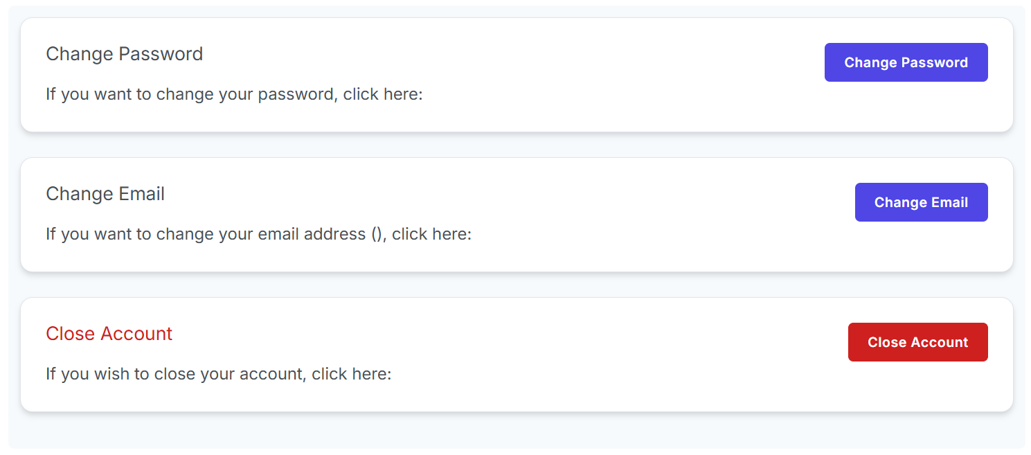 - Account management options for password changes, email updates, and account closure