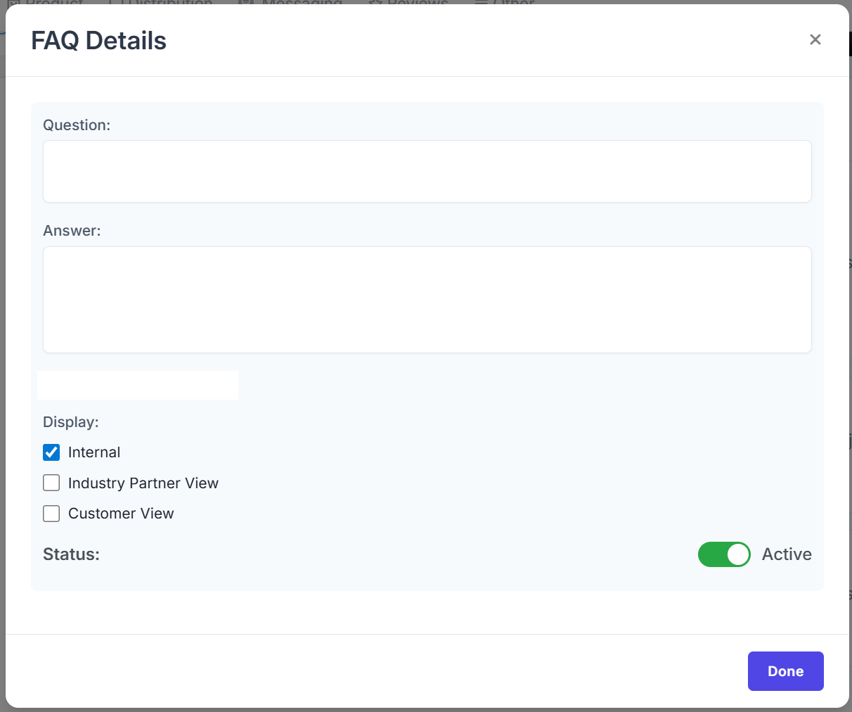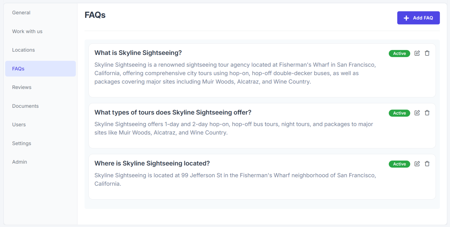 - Active or Inactive status toggle for each FAQ entry