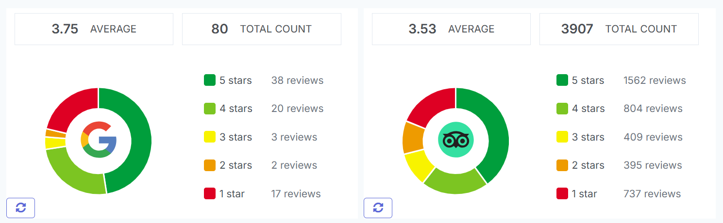 - Average star ratings and review counts from Google and TripAdvisor