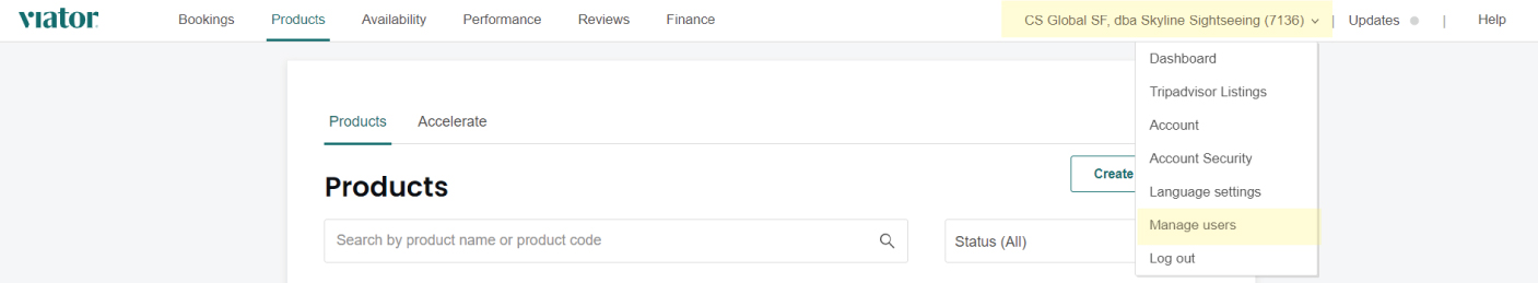Log in to Viator, open your account settings dropdown, and select Manage users.