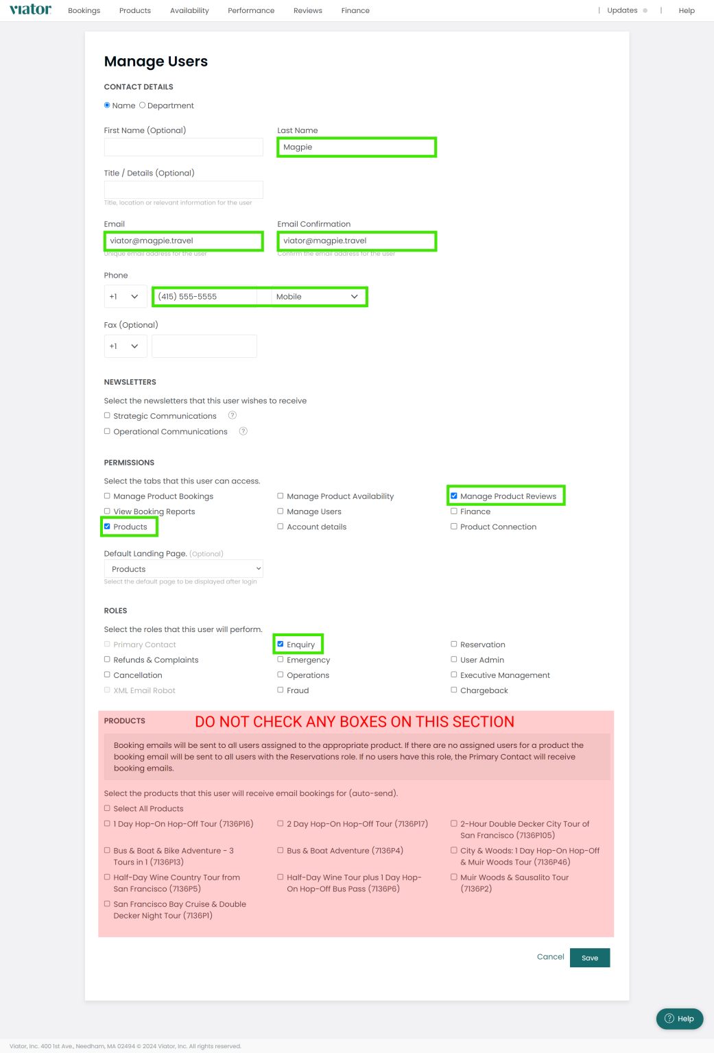 Set up the new user with the required configuration settings as shown in Viator's user management interface, then click Save.