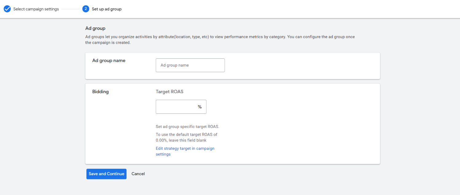 Name your Ad Group and optionally set a different Target ROAS for this specific group.