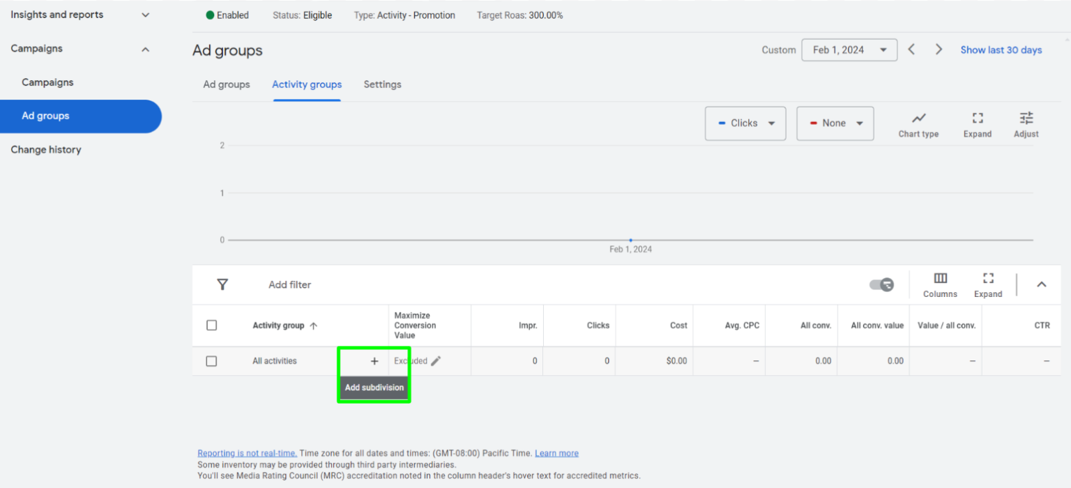 Click the arrow next to All Activities to add subdivisions for targeting specific products.