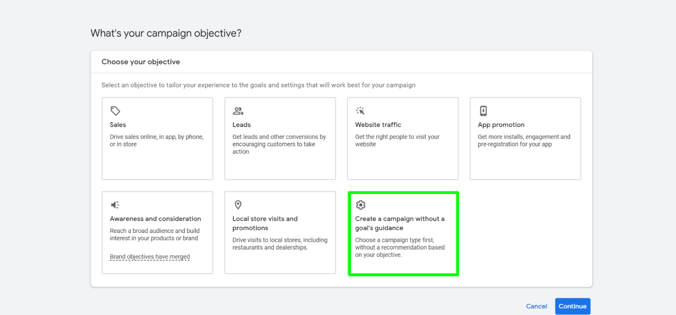 Once linked, select Create a campaign without a goal's guidance as your campaign objective.