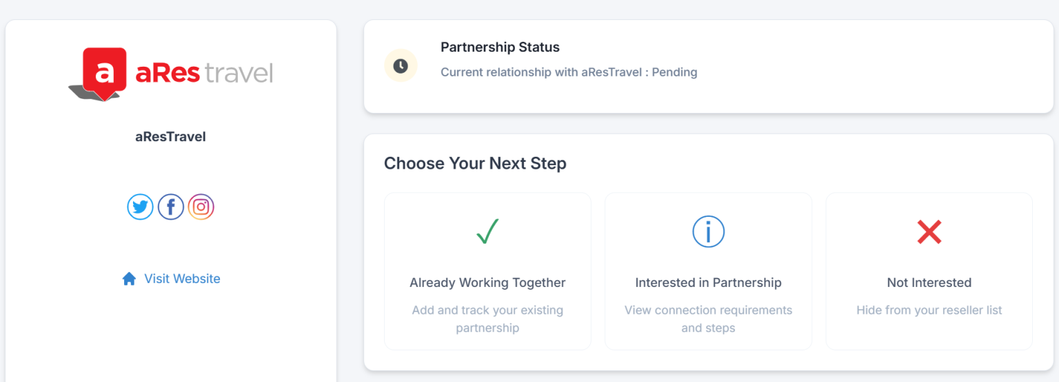 When you access a reseller's profile, you can choose from three relationship types:
